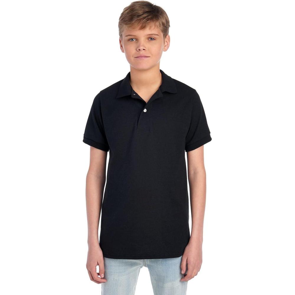 Jerzees Boys’ Youth Short Sleeve Polo Shirts, Cotton Blend, Two Button Closure, Regular Fit, Sizes S-XL(Black)